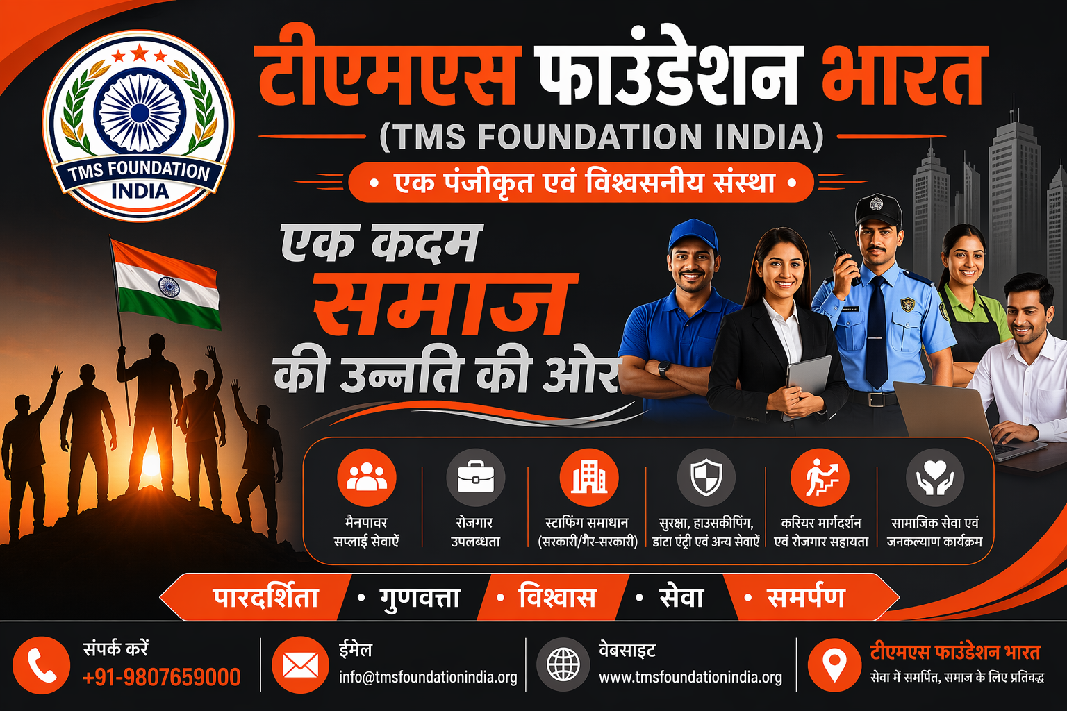 TMS Foundation India भारत का एक प्रतिष्ठित, विश्वसनीय और समाज सेवा के प्रति समर्पित संगठन है, जो राष्ट्र के समग्र विकास हेतु निरंतर कार्यरत है। यह संस्था शिक्षा, स्वास्थ्य, कौशल विकास, रोजगार सृजन और सामाजिक उत्थान के माध्यम से देश के नागरिकों को सशक्त बनाने का संकल्प लेकर स्थापित की गई है। संगठन का मुख्य उद्देश्य समाज के हर वर्ग—विशेषकर गरीब, वंचित और जरूरतमंद लोगों—को सहयोग प्रदान कर उन्हें आत्मनिर्भर बनाना है।